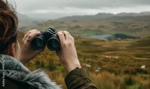 first person view of human hands with binoculars, landscape with sheep grazing, serenity and exploration of nature and rural beauty