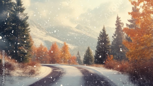 First snowfall on a happy sunny day in scenic mountain landscape with copy space