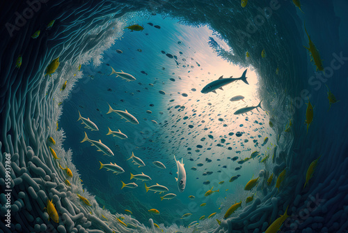 Fish colony, fishing, and ocean nature scene with many little fish in the sea below the surface. Generative AI