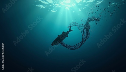 Fish Entangled in Fishing Net Underwater, Ocean Pollution Concept