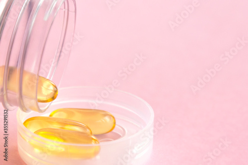 Fish oil capsules with omega 3 and vitamin D, healthy concept