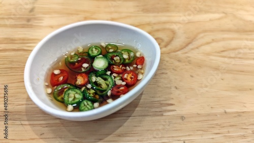 Fish sauce with chilli in white bowl on wooden table. Traditional Thai fish sauce style with red and green chilli.
