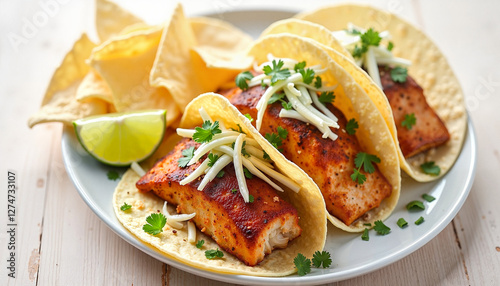 Fish tacos with lime and tortilla chips, vibrant and appetizing, on a stylish plate