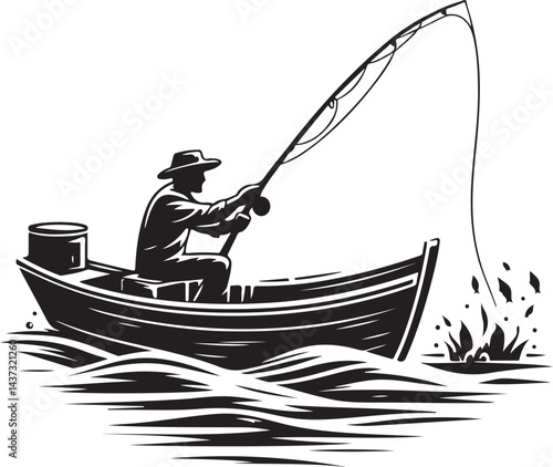 Fisherman Casting Line from Rowboat Minimalist Vector Silhouette Illustration fishing boat in the sea new 2025 trendy