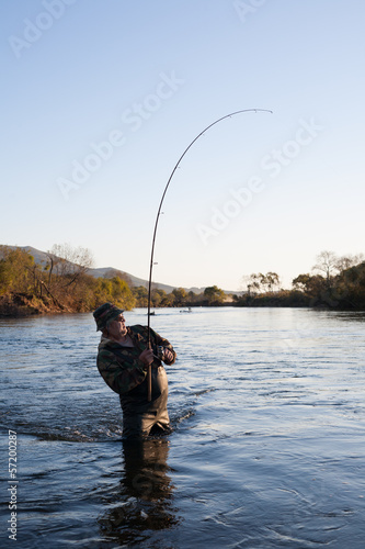 Fisherman catches of salmon at sunset.