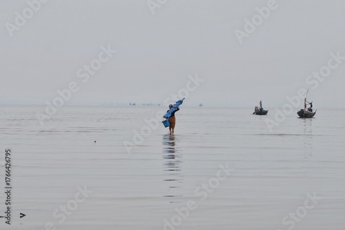 Fisherman Wading in Shallow Sea with Small Boats in Misty Horizon Under Gray Sky
