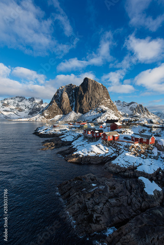 Fishermen’s cabins (rorbu) in the Hamnoy village under blue sky in winter season, Lofoten islands, Norway