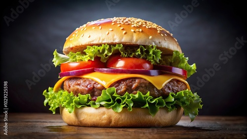 Fisheye tasty burger with large meat patty, tomatoes, onions, cheese, and lettuce
