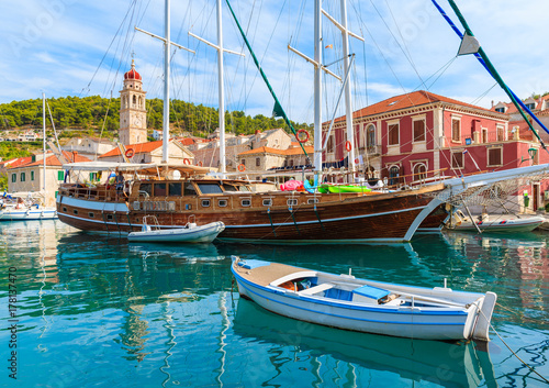Fishing boat and wooden yacht in Pucisca beautiful port, Brac island, Croatia