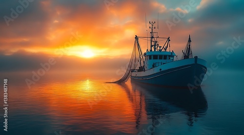 Fishing Boat At Dawn Serene Waters Reflecting A Golden Sunset With Mist