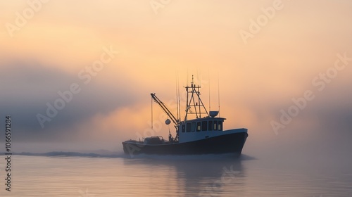 Fishing boat gliding through a foggy morning on the water near a serene coastal landscape