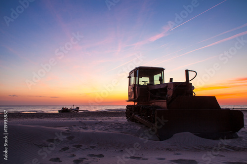 Fishing boat transporter at sunset
