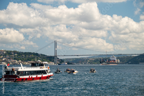 Fishing boats on the Bosphorus with large ships passing under the Bosphorus Bridge in Istanbul, Turkey on a bright day with scenic clouds, hills, and a Turkish flag in the background.