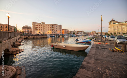 Fishing boats on the water in Ortigia island with the cityscape of Syracuse in the evening