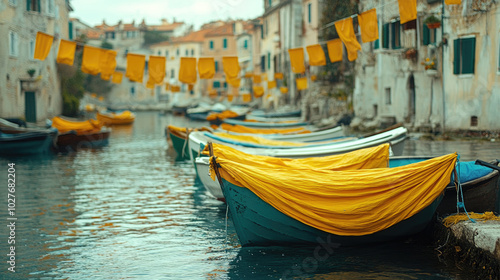 Fishing boats rest peacefully in a charming canal, adorned with vibrant yellow fabric hanging above on a calm afternoon