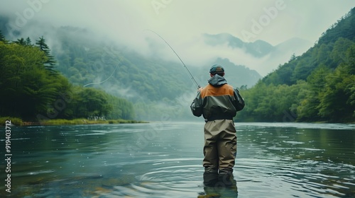 Fishing for Trout by Spinning on a Mountain River with Misty Forest Background