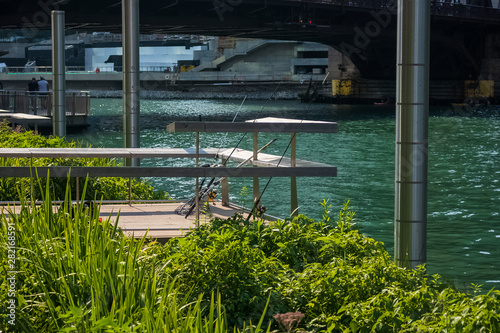 Fishing poles leaning against pier along Chicago River amongst floating ecosystem garden beds