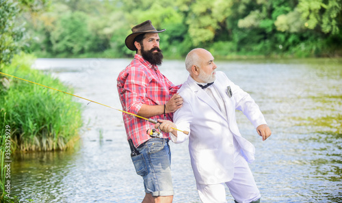 Fishing skills. Men friends relaxing nature background. Personal instructor. Bearded man and elegant businessman fish together. Learn to fish. Fish with companion who can offer help in emergency