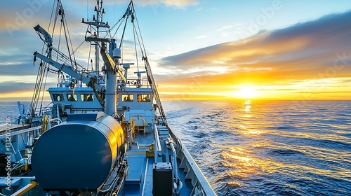 Fishing vessel at sunset on the open sea. Modern fishing trawler navigating the ocean at golden hour