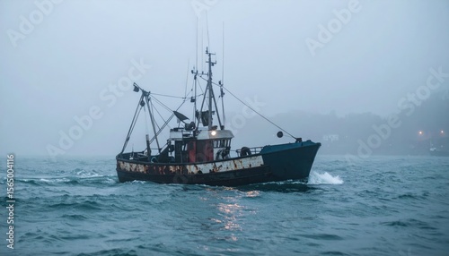Fishing vessel on choppy waters, low visibility, gray, metallic