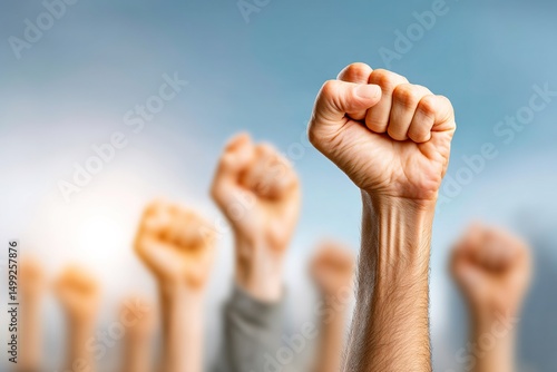 Fists raised up against the sky. The concept of protest and revolution. Generative Ai