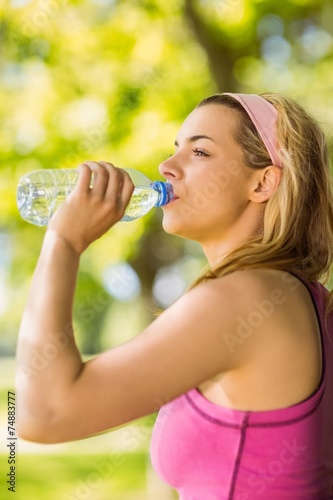 Fit blonde leaning against tree drinking water