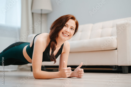 Fit happy woman does yoga on the floor and shows her thumbs up.Concept of sports home.
