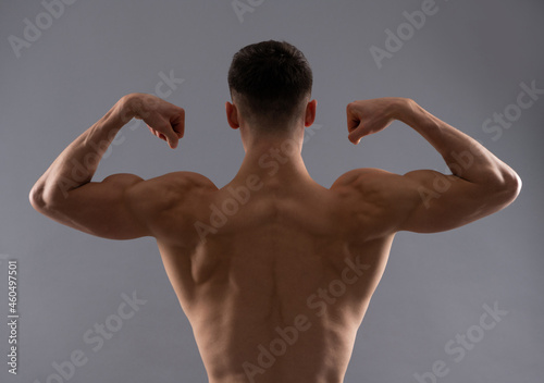 Fit man rear torso flex arm muscle showing biceps triceps grey background, flexing