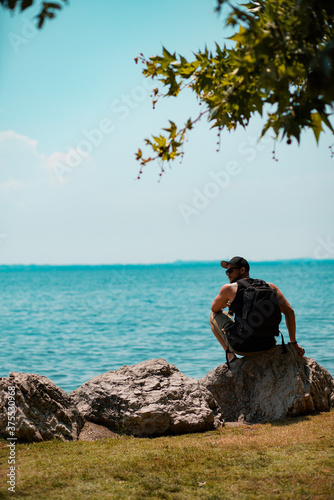Fit Man sitting on a rock in front of a blue lake