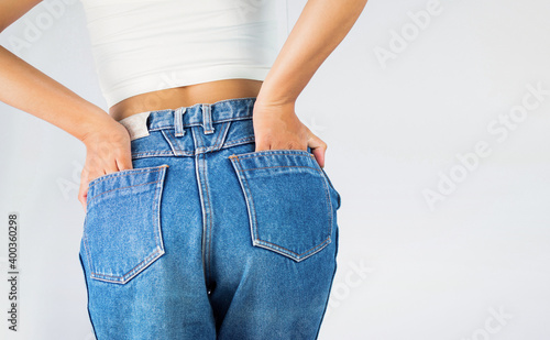 Fit shape Woman wearing of body jeans pants from back. Female bottom in tight jeans on white isolated- Image