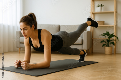 Fit woman doing plank leg lift during home workout on mat