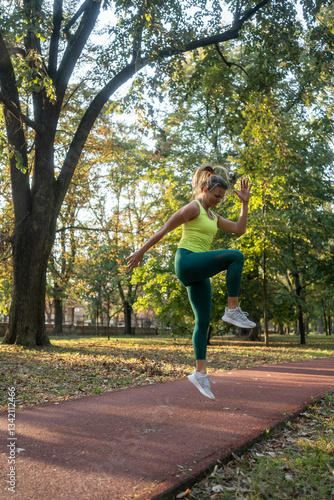 Fit woman exercising outdoors. Healthy mature female athlete doing fitness workout. Sportswoman raising leg, do functional training outside on bright sunny day, smiling pleased, wearing sport outfit