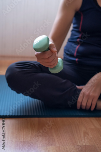 fit woman lifts dumbbells at home.Young woman doing sports on a blue mat.