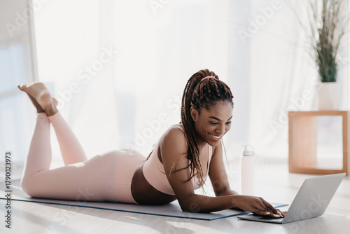 Fit young black woman in sportswear is lying on a mat, using her laptop to check fitness videos and relax after an intense home workout session. She enjoys a moment of rest and focus.