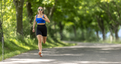 Fit young woman jogging in park smiling happy running and enjoying a healthy outdoor lifestyle