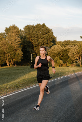 Fit Young Woman Running through City Park Road