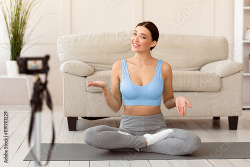 Fitness Blogging. Cheerful Blogger Girl Making Video For Online Yoga Course Sitting On Mat At Home. Selective Focus