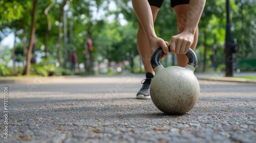 Fitness coach showing kettlebell form in outdoor setting, focusing on technique strength training. Ai generated