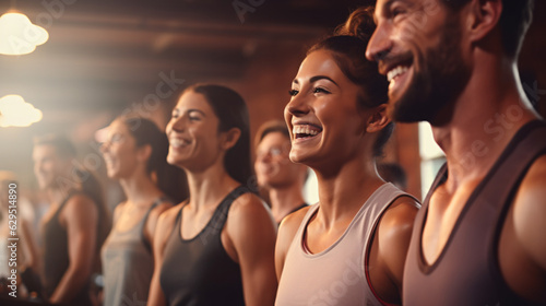 Fitness enthusiasts enjoying a workout session at the gym, friends train together. Participating in a cheerful Pilates class, expressing happiness through exercise, Generative AI.