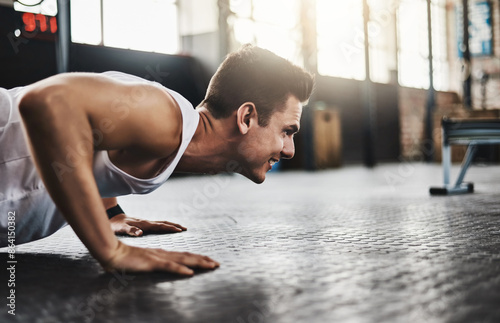 Fitness, floor and man with pushups in gym for power workout, endurance exercise or strength challenge. Wellness, athlete and person lifting body weight for muscle gain, training or performance