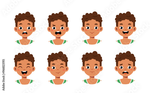 Fitness guy constructor. Man in sportive uniform. Kit for customizations. Pack of face with various emotions. Active lifestyle and sports. Flat vector collection