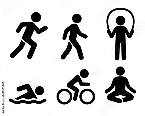 Fitness Icon Set: A collection of simple black and white icons depicting various physical activities such as running, walking, jump rope, swimming, cycling, and meditation.