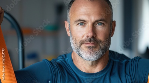 Fitness motivation middle-aged active life. Focused man with a determined expression and fitness equipment.