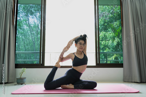 fitness, people and healthy lifestyle concept - Woman wearing sportswear practicing mermaid asana at home for health and a firmer body.Eka pada rajakapotasana pose
