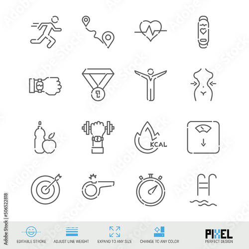 Fitness, physical education and sports, weight loss related vector line icon set isolated on white. Pixel perfect design. Editable stroke. Adjust line weight. Expand to any size. Change to any color.