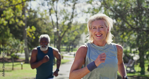 Fitness, senior couple and running in park for wellness, cardio exercise and training in retirement. Interracial people, elderly and outdoor for workout with support, happiness or friends with energy