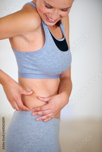 Fitness, stomach and woman holding skin for health, wellness and weight loss goals in a training studio. Smile, happy and young female person athlete showing body for exercise or workout at gym.