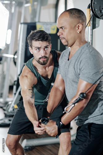 Fitness trainer controlling strong man doing exercise in cable crossover machine