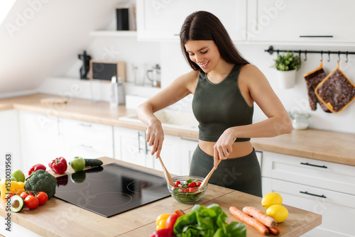 Fitness woman preparing fresh salad in her kitchen, slimming on healthy dieting routine, lady wearing sportswear and mixing ingredients in bowl