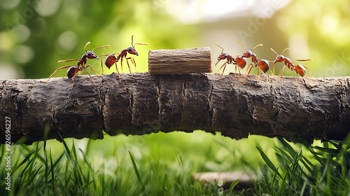 Five ants working together to carry a large piece of wood on a tree branch.